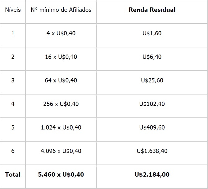 Veja então uma demonstração somente deste bônus: Caso você indicasse 4 pessoas e sua equipe fizesse o mesmo. Os valores acima se referem ao ganho bruto do Bônus Residual por Anúncio |