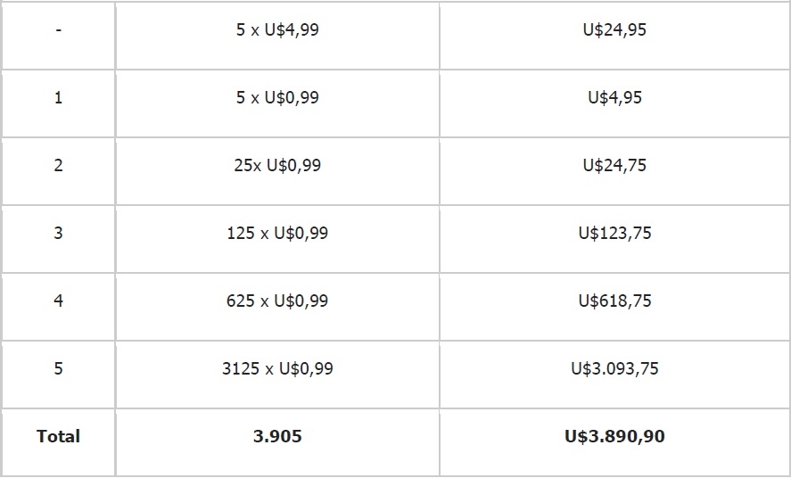 Através da postagem dos anúncios que fazemos diariamente é que divulgamos o produto da empresa e quando a pessoa clica no anúncio e compra o serviço 99TelexFREE através de seu link, você ganha 90% do valor do produto voip, ou seja, você ganha U$ 44,91. Agora se seu indicado direto fizer a venda do produto voip, isto lhe renderá 10% da mensalidade que pagarão, neste caso U$49,90. Ou seja, você receberá U$4,99 de cada um deles mensalmente. Mas não pára por ai… Quando seus indicados indiretos venderem o produto voip, você também vai ganhar 2%, ou seja, U$0,99, até o 5° nível.
